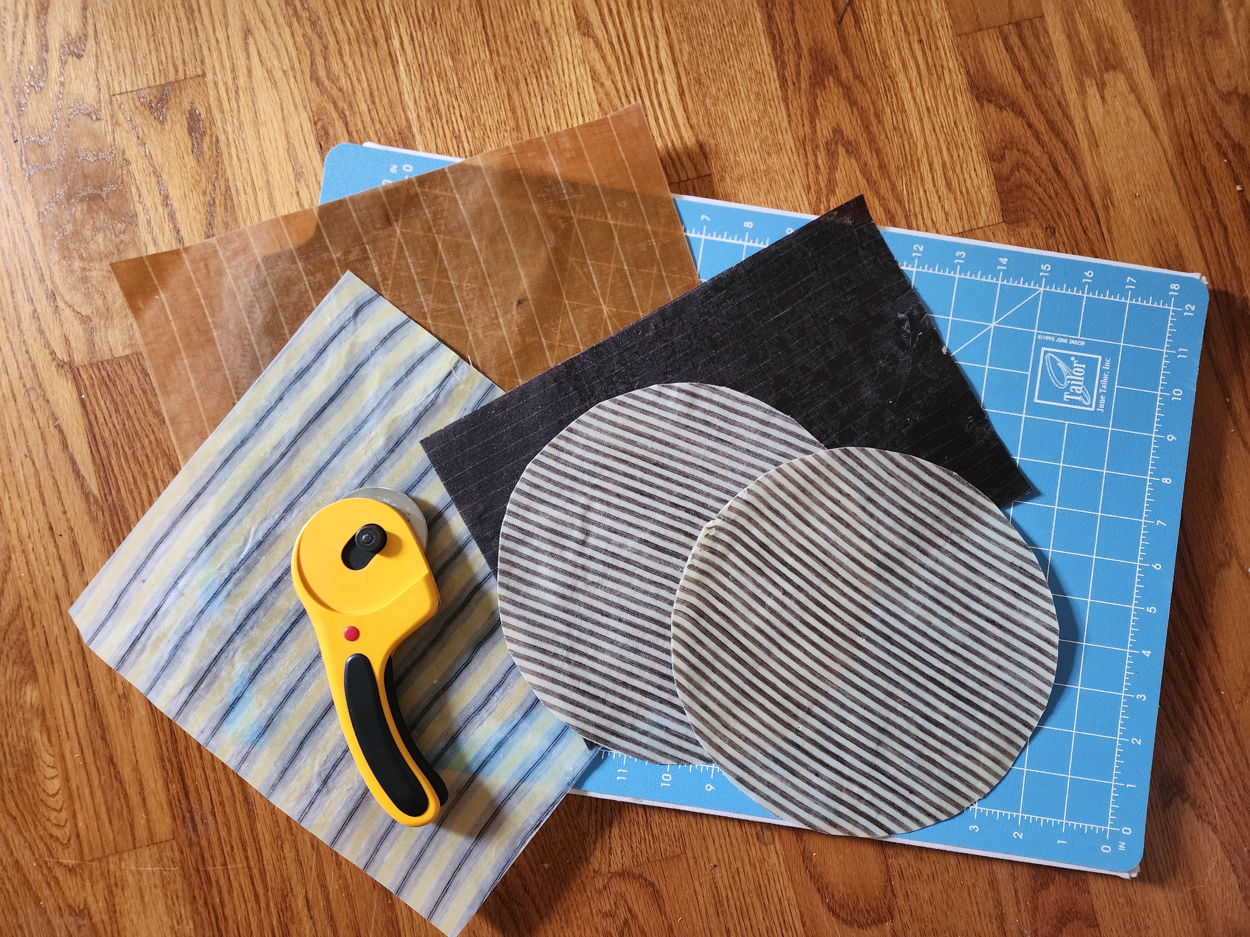 I decided to give all the pieces one last pressing to even out the wax. I placed each between two clean pieces of parchment and ironed them. Then I trimmed the edges with my rotary cutter. I cut the two smaller ones into circles to use on my crocks.